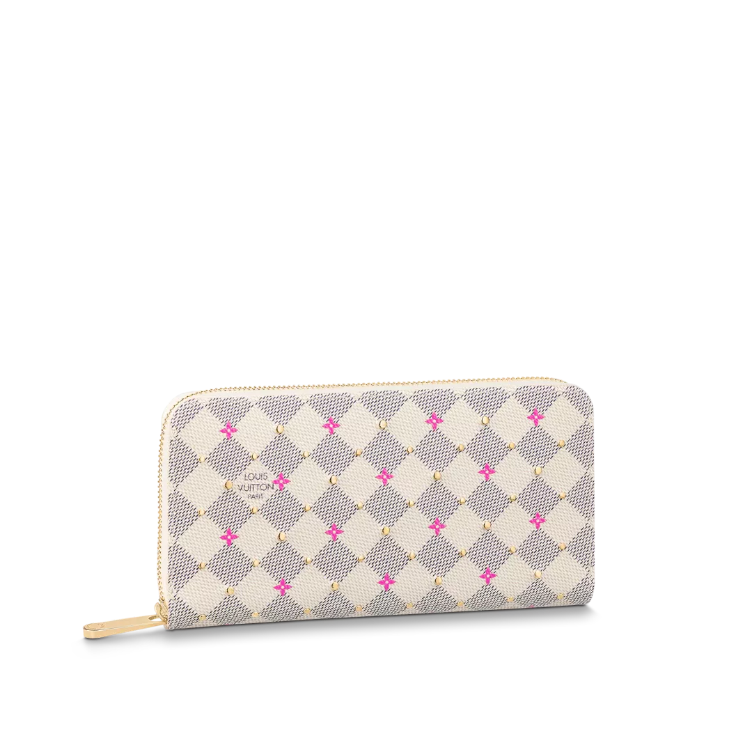 “Zippy Wallet” reinterpreted for the “Damie Azul Studs” collection. Damie Azul canvas with fuchsia pink floral motif print and small gold-coloured studs. The contrasting pink lining that emerges when you open the reassuring round zipper and the interior with multiple compartments, pockets and card slots are also attractive.